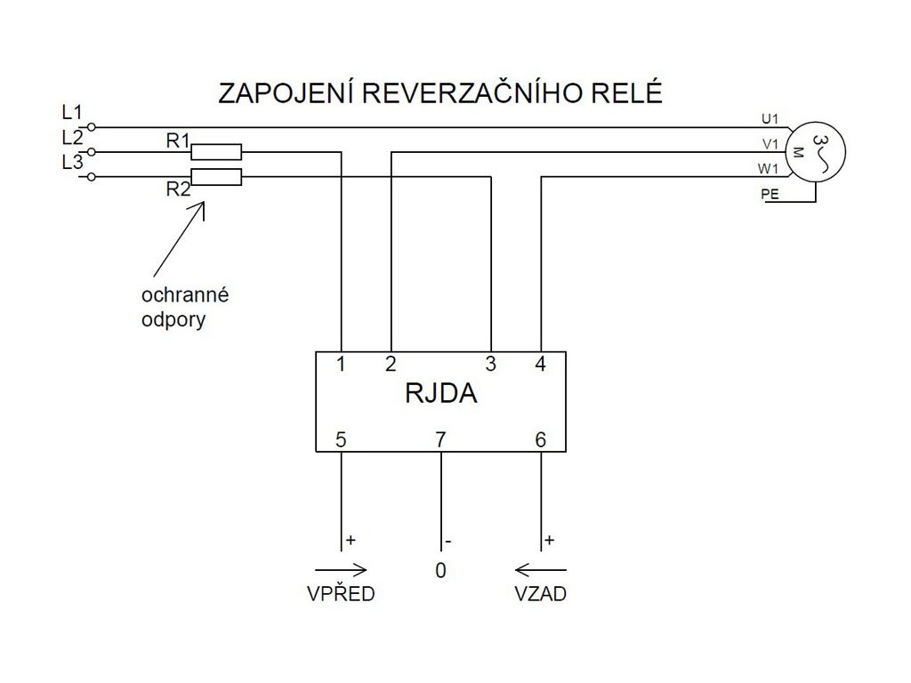Pro ochranu reverzačních relé je nutné zapojit do přívodu 2 ochranné odpory dle obrázku a tabulky. U polovod. relé s triaky občas dochází při prudkém nárůstu napětí k otevření triaku, což u reverzačního relé znamená 2 fáze ve zkratu, velký proud a zničené relé. Právě tyto odpory mají omezit velikost proudu max. na povolenou hodnotu proudu pro 1 periodu - bývá 8 -10ti násobek jmenovitého proudu relé, a pak musí zareagovat rychlá proudová ochrana. Odpory volte podle velikosti proudu motoru.